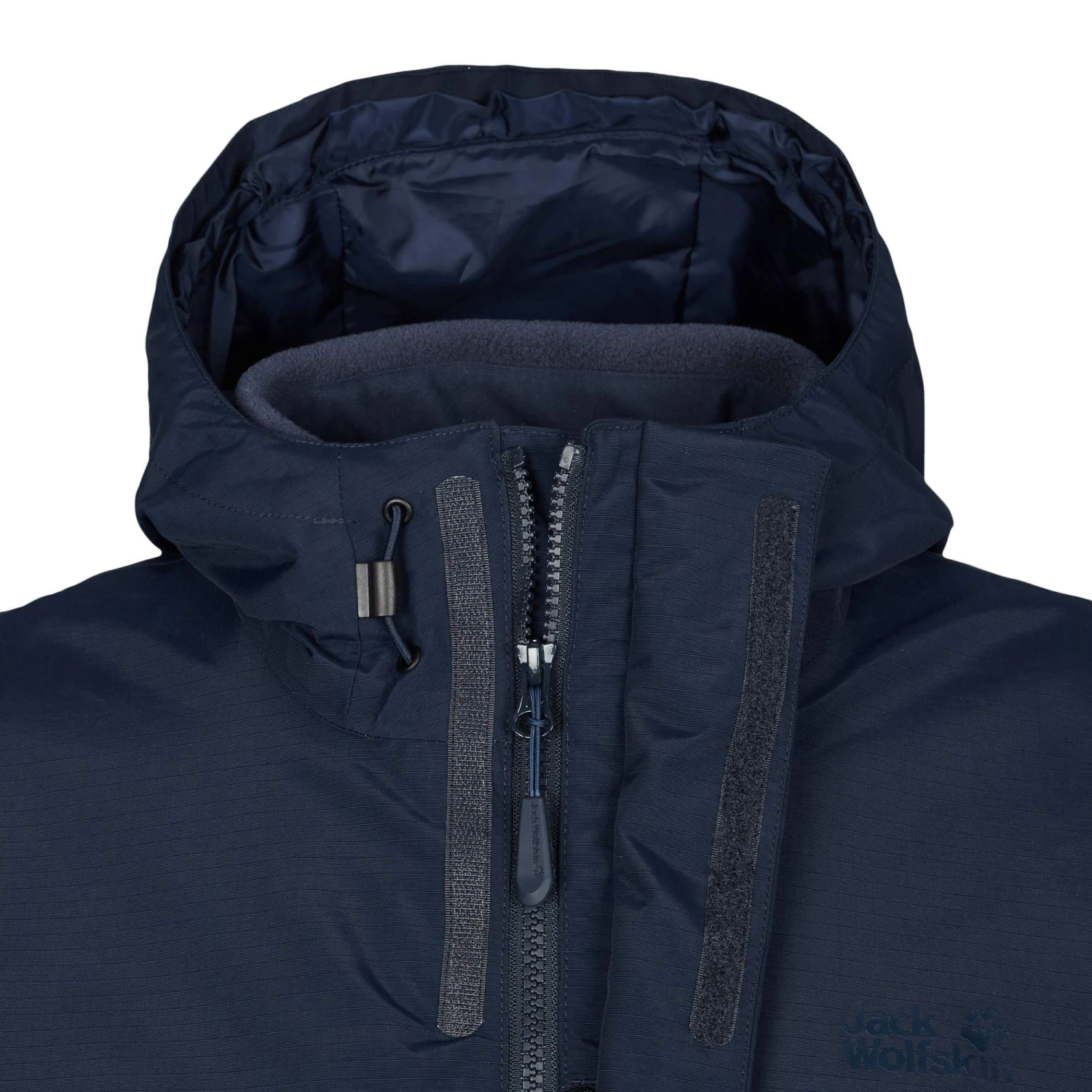 - Kapuze vorne regulierbar per Schnürzug, hinten regulierbar per Klett